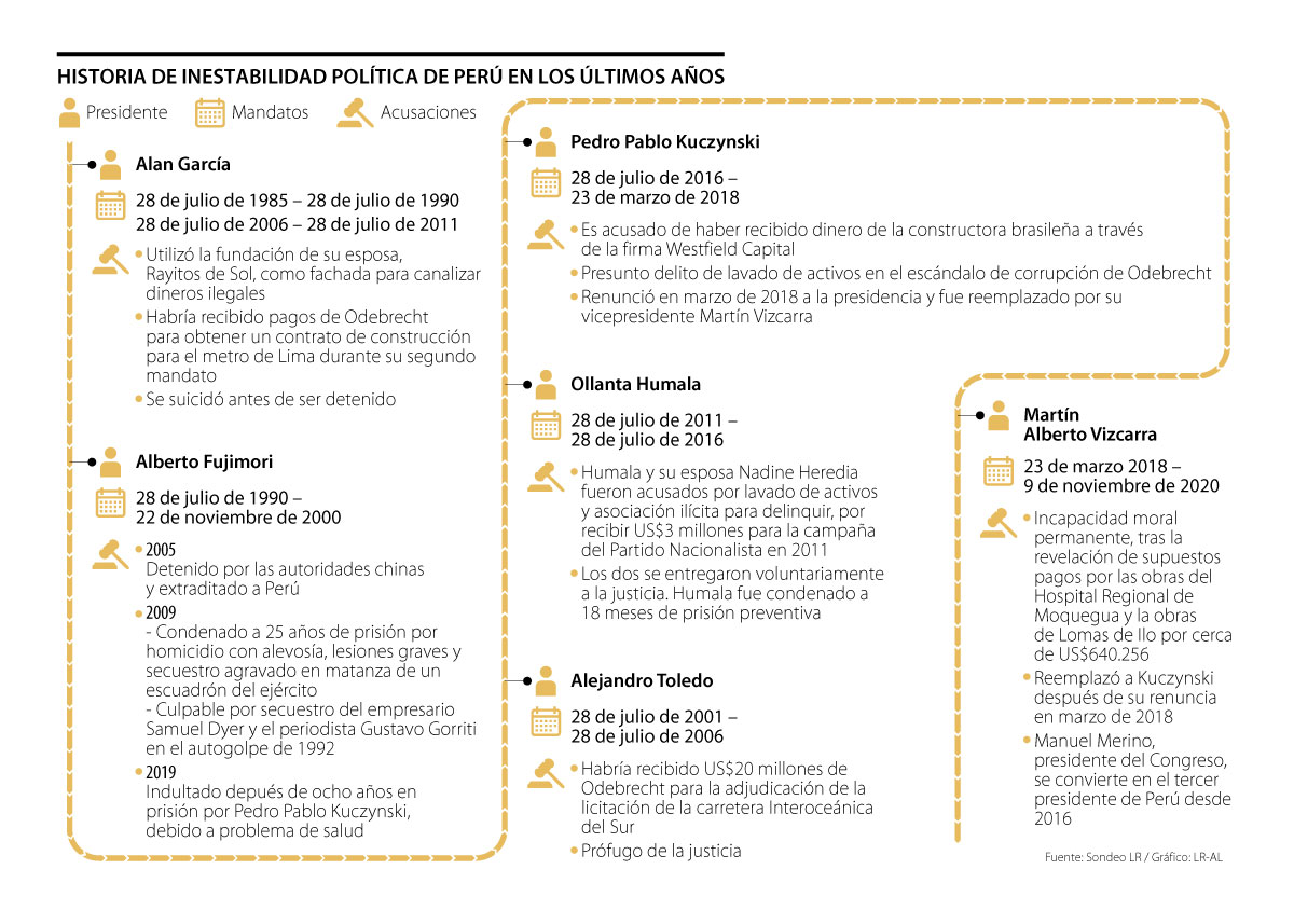 Ahora, no es la primera vez que la política peruana se enfrenta a un presidente que sale o está envuelto en escándalos o actos ilícitos, el caso de Vizcarra se suma al de Alan García, Alejandro Toledo, Ollanta Humala, su antecesor, Pedro Pablo Kuczynski, y el de Alberto Fujimori, este último el único destituido en la historia reciente. Las anteriores vacancias se dieron en 1823 y en 1914.