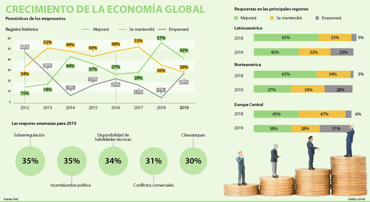 Este porcentaje corresponde al peor registro en los últimos siete años y no solo está basado en las preocupaciones que generan temas internacionales como la guerra comercial entre China y EE.UU., el caos del Brexit o la desaceleración de China; sino también en temores internos como la sobrerregulación, la incertidumbre política, la falta de habilidades técnicas, conflictos comerciales y los ciberataques.