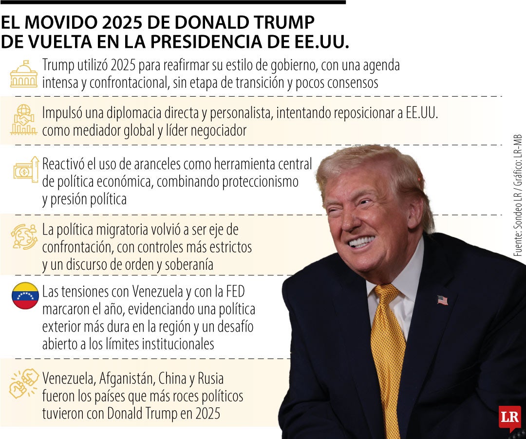 El primer año del nuevo mandato de Donald Trump estuvo marcado por una agenda intensa y deliberadamente confrontacional, tanto en el frente internacional como en la política interna. Lejos de optar por una etapa de transición, Trump utilizó 2025 para reafirmar su estilo de gobierno y dejar claro el rumbo que pretende seguir durante el resto de su presidencia. Cinco grandes ejes explican el tono y las decisiones que definieron este primer año.
