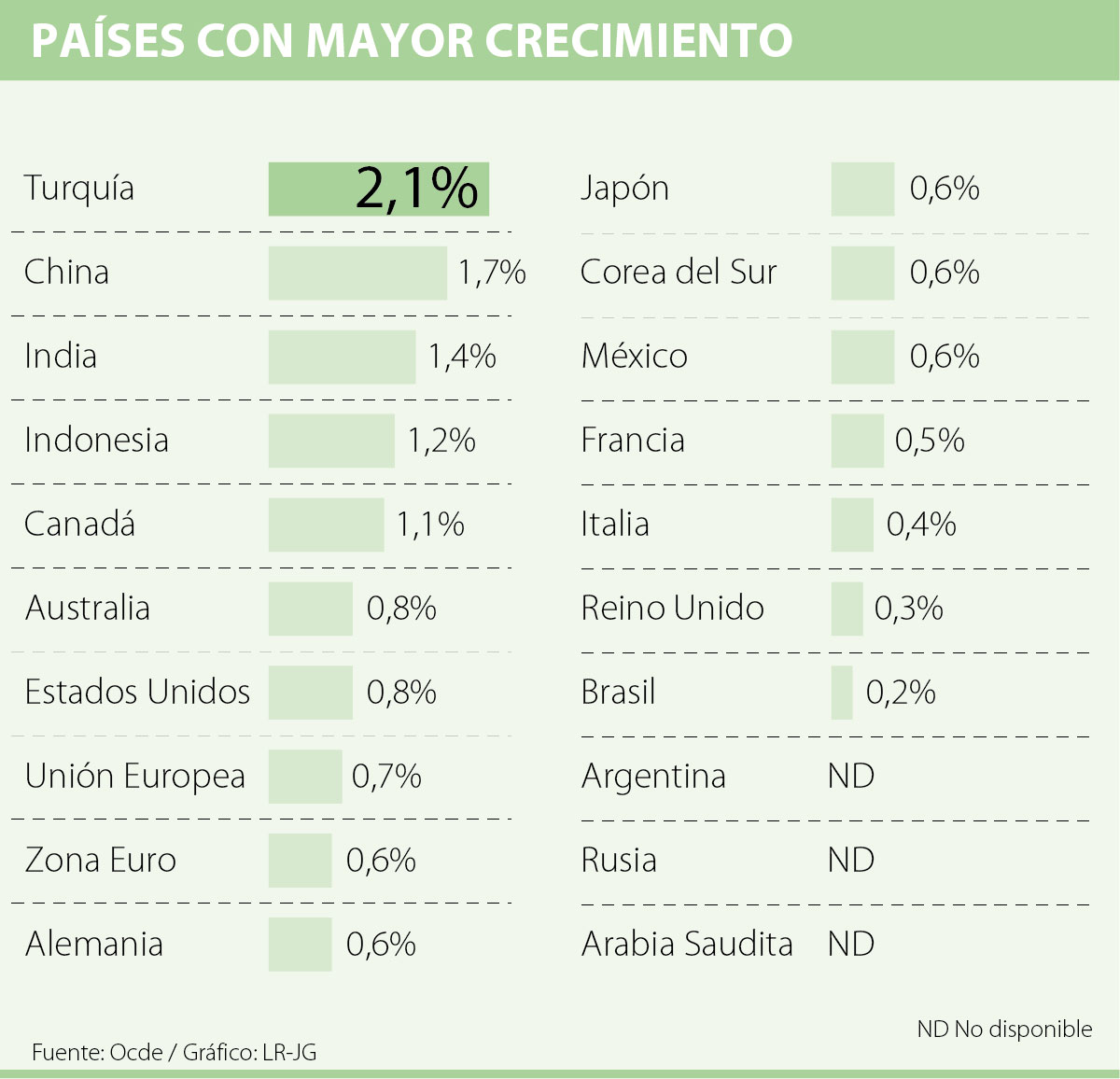 Según el listado, los líderes durante el segundo trimestre fueron Turquía, que tuvo un crecimiento de 2,1% frente a 1,3% que presentó en el trimestre anterior. China, segunda mayor economía del mundo, se llevó la medalla de plata ya que presentó un incremento de 1,7% comparado con 1,3% en el primer trimestre del año.