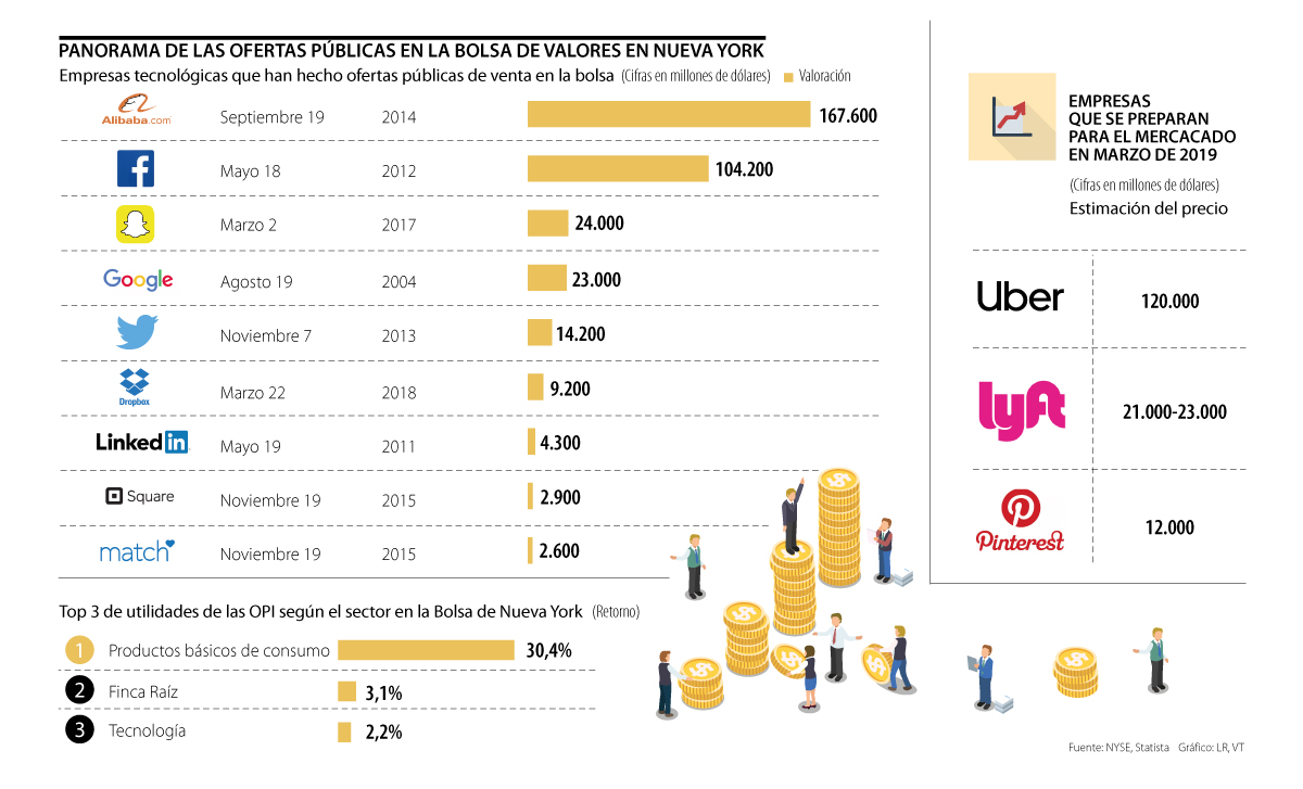 Según el último balance entregado por el mercado bursátil en Nueva York, el sector de la tecnología es el segundo que más tuvo éxito en las OPI que realizó durante 2018 con un retorno a la inversión de 2,2%. El primer lugar lo ocuparon los productos básicos de consumo, con 30,4%; y el segundo la finca raíz, con 3,1%.