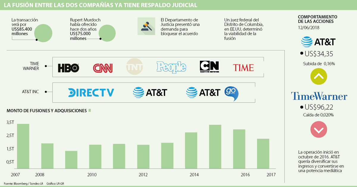 A pesar de que el Departamento de Justicia de EE.UU. intentó bloquear el año pasado esta fusión debido a las preocupaciones de que AT&T, propiedad de DirecTV, podría cobrar a los distribuidores rivales más por el contenido de Time Warner, lo que resultaría en precios más altos para los consumidores, el juez aprobó ayer el proceso de compra sin ninguna condición. Además, indicó que este acuerdo no viola la ley antimonopolio. “Espero que el gobierno tenga la sabiduría y el coraje para no buscar una apelación”, sentenció.
