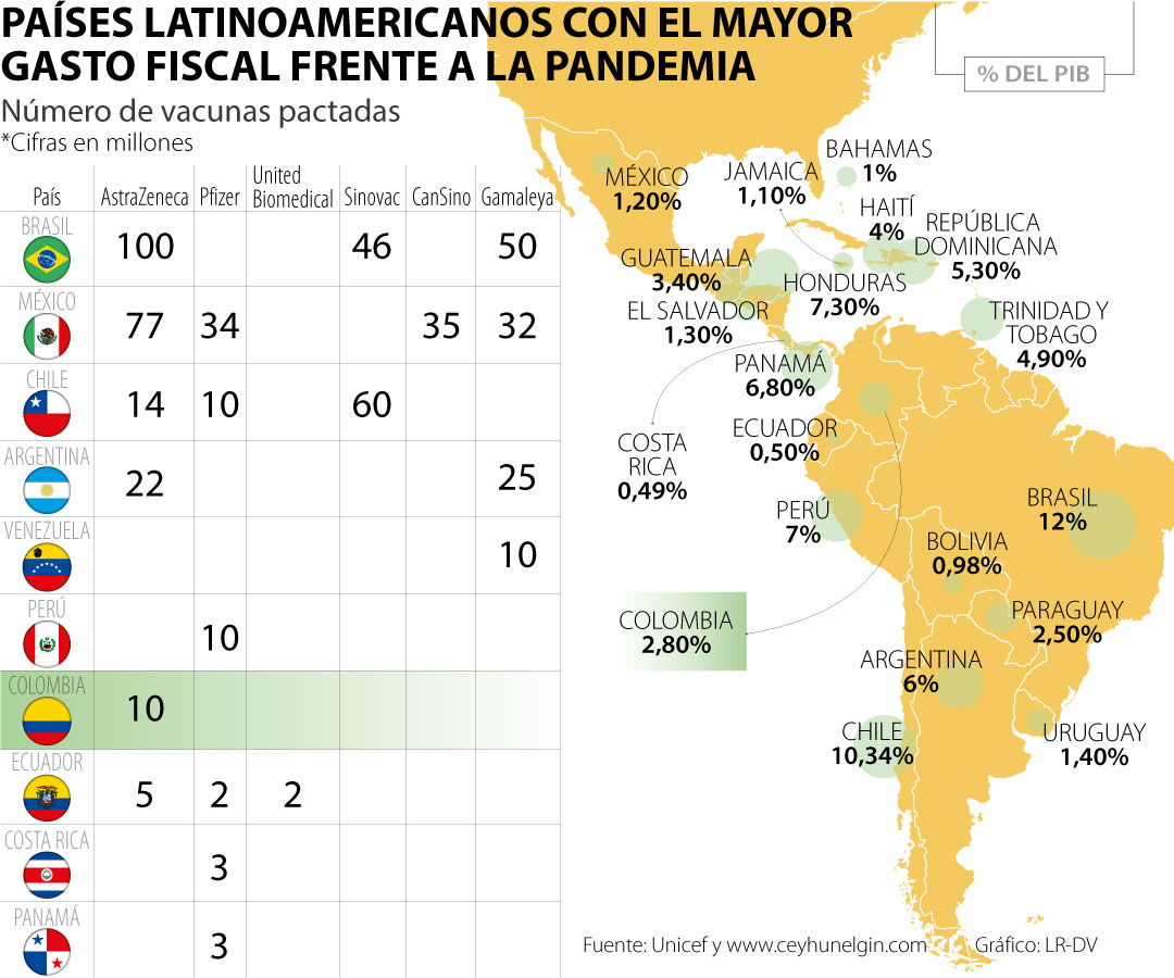 Por otra parte, Argentina adquirió un total de 22 millones de dosis de AstraZeneca y 25 millones de la rusa Sputnik V. El gobierno de ese país afirmó que destinó alrededor de US$170 millones en la compra de dichas dosis y es, hasta el momento, una de las naciones de la región que más unidades ha asegurado.