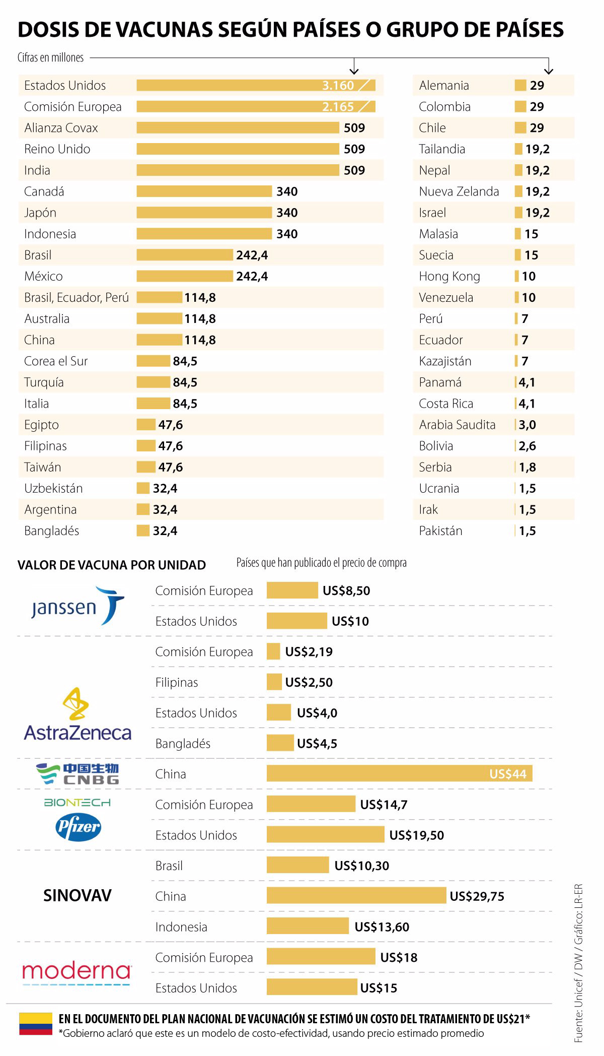Colombia, por su parte, anunció hace unas semanas la adquisición de 40 millones de vacunas. Además, según el Ministerio de Salud, se destinará un total de US$6.432 millones para cubrir a 51 millones de personas; la unidad costaría alrededor de US$21 y las primeras empresas con las que se adquirirán las dosis serán Pfizer y AstraZeneca. Aún no se ha determinado el precio según la empresa, pero según el documento presentado por Minsalud como el Plan Nacional de Vacunación contra el covid-19 (Página 36, adjunto documento al final de la nota), definen un costo del tratamiento de US$21.