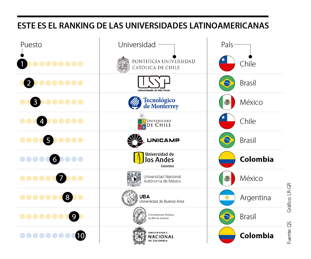 Además de Los Andes y la Nacional, las universidades colombianas que destacaron dentro del listado de QS fueron la Universidad de Antioquia, que se posicionó en la casilla 13; la Universidad Javeriana, que se ubicó en la posición 18; y la Universidad del Rosario, que acabó en el puesto 40.