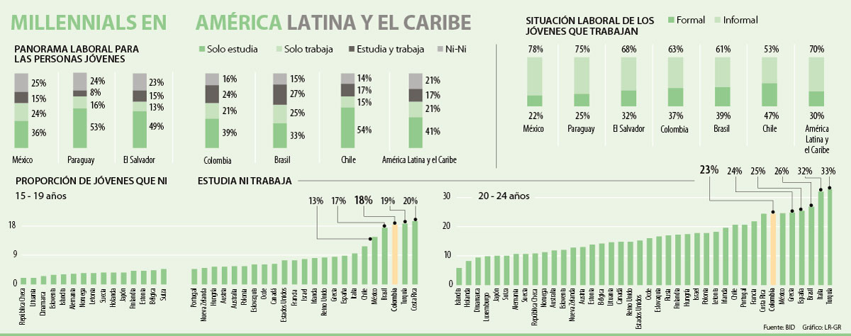 Dicho panorama se ve reflejado en el libro ‘Millennials en América Latina y el Caribe: ¿trabajar o estudiar?’, elaborado por el Banco Interamericano de Desarrollo (BID), que realizó una encuesta a 15.000 jóvenes de nueve países de la región entre 15 y 24 años de edad acerca del escenario estudiantil y laboral que enfrentan en su país. Los resultados de Colombia muestran que 39% solo estudia, 21% solo trabaja, 24% estudia y trabaja y 16% no realiza ninguna de las dos actividades.