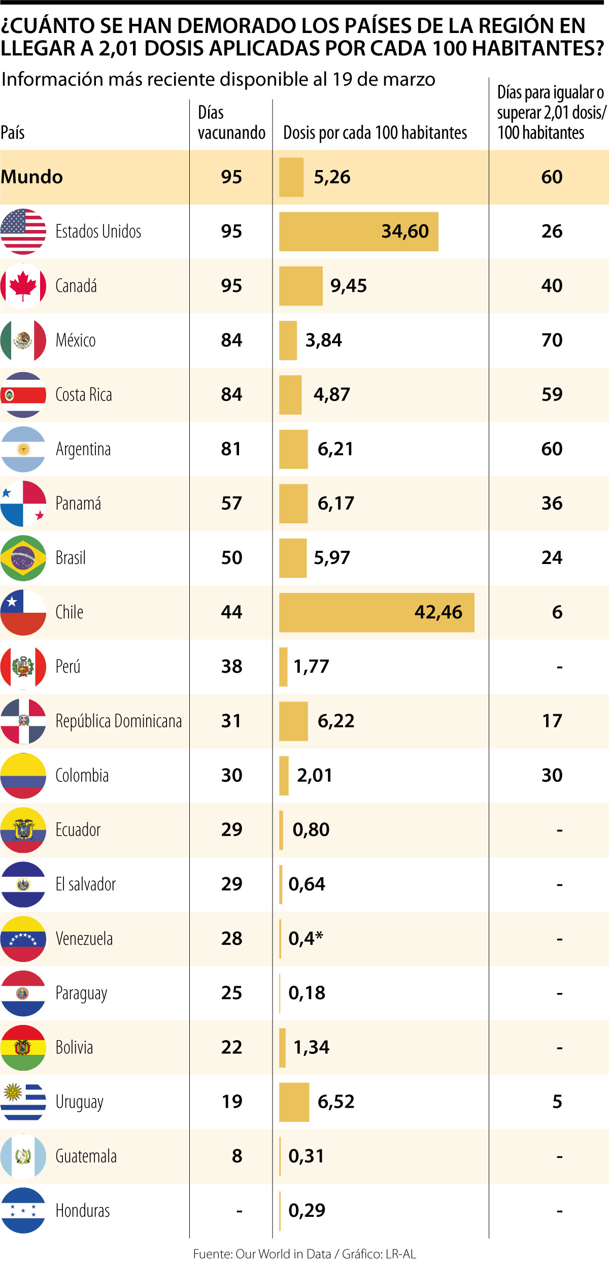 Para calcular la velocidad relativa frente a la rapidez global, LR se basó en los datos más recientes de cada país publicados en Our World in Data al 19 de marzo de 2021. Con esta información, se contaron cuántos días le tomó a cada país igualar o superar la aplicación de 2,01 dosis por cada 100 habitantes.
