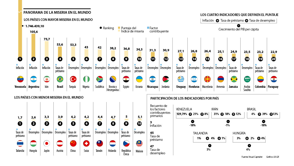 Venezuela registró una inflación de 929,79%, su tasa de préstamo fue de 21% y la tasa de desempleo fue de 8%. El resultado de la suma de estos índices menos el PIB per cápita del -18%, arrojó una puntuación en el Índice de Miseria del 1.746.439,10%, una cifra que se aleja de los récords registrados por los demás países. Argentina ocupó el segundo lugar en la clasificación como consecuencia de la crisis económica que está viviendo y su puntaje en el Índice fue de 105,6%. En el caso de Irán, que ocupó la tercera casilla, los indicadores son muy diferentes: la inflación es de 31%; la tasa de préstamo 18%; la tasa de desempleo 12%; y un PIB per cápita de -1%. Así, ese país tuvo 75,7% en el puntaje del Índice de miseria.
