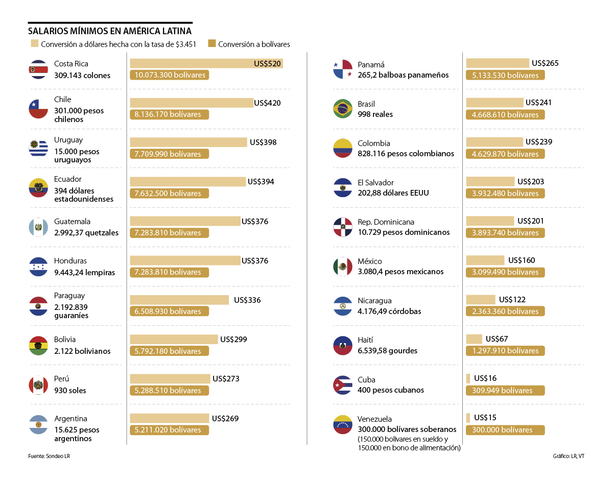 Primero hablemos de la región. Hicimos el ejercicio de pasar a dólares los salarios mínimos (en sus monedas locales) de los principales países del continente. Utilizamos Oanda, el conversor de moneda en línea para conocer las cifras. Pese al incremento que representa este nuevo decreto anunciado por Maduro, Venezuela sigue siguiendo el país con el salario mínimo más bajo de América Latina. Esto, sin contar que pese al anuncio no se tiene certeza de cuándo entrará a regir el alza o si afectará a más de cuatro millones de personas que reciben pensiones homologadas al salario mínimo en el país.
