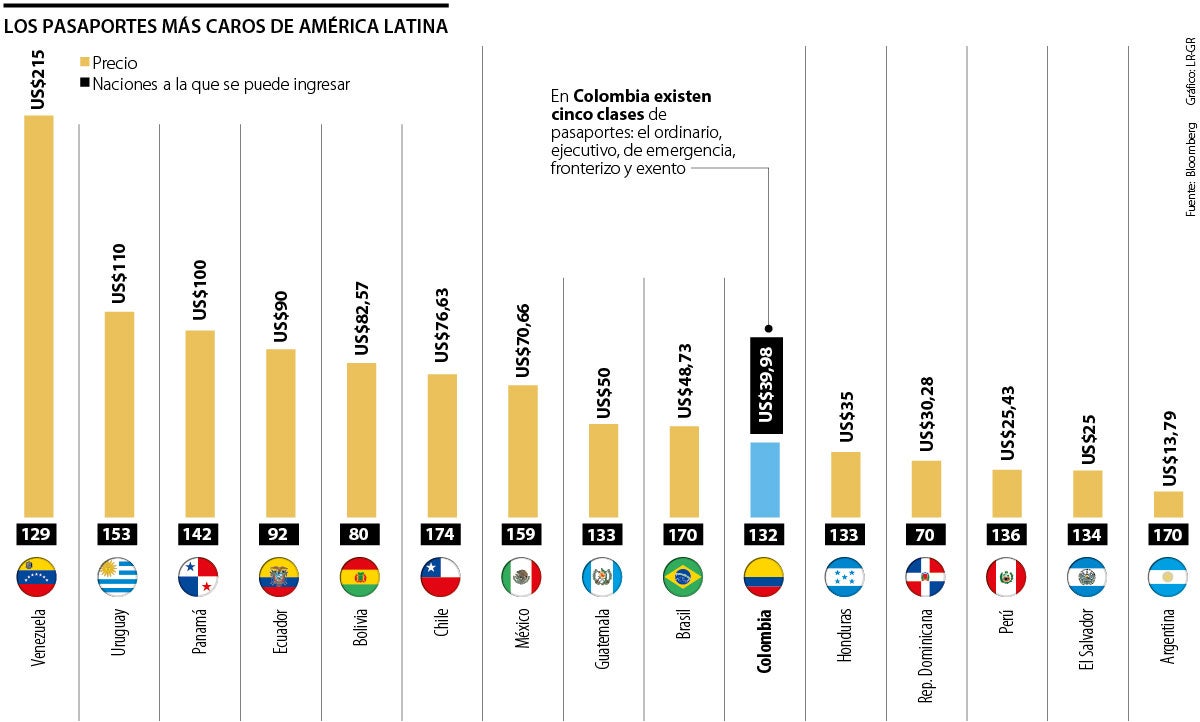 Colombia ocupa el décimo puesto entre los países de la región con el pasaporte más caro. Su trámite tiene un costo de US$39,98; es decir, $172.000 el ordinario, mientras que el ejecutivo vale $262.000, y el de emergencia $161.000. Con el pasaporte colombiano se puede viajar a 132 países en diferentes partes del mundo. La diferencia de estos documentos consiste en la cantidad de páginas y el tiempo de vigencia.
