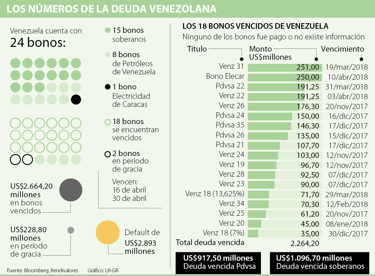 Según información suministrada por Rendivalores, casa de bolsa venezolana, todos los bonos que se encuentran vencidos mantienen atrasados los pagos de intereses, pero ninguno el capital. Las obligaciones en periodo de gracia suman US$228,80 millones, mientras que el total de los bonos vencidos es de US$2.664,20 millones, lo que genera a Venezuela un default de US$2.893 millones. Este año también vencen dos bonos soberanos y amortiza uno de Petróleos de Venezuela (Pdvsa).