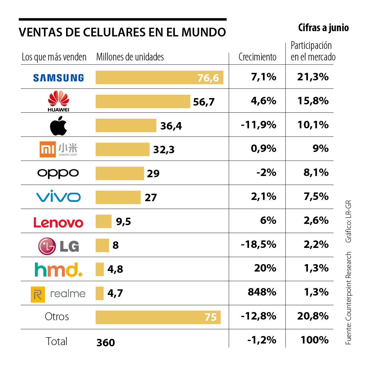 La firma Counterpoint Research dio a conocer los resultados globales de ventas de teléfonos móviles durante el segundo trimestre del año. Comparado con abril, mayo y junio del año pasado, las unidades vendidas cayeron 1,2%, al registrarse 360 millones de unidades nuevas en el período, dato que un año atrás era de aproximadamente 364,3 millones.