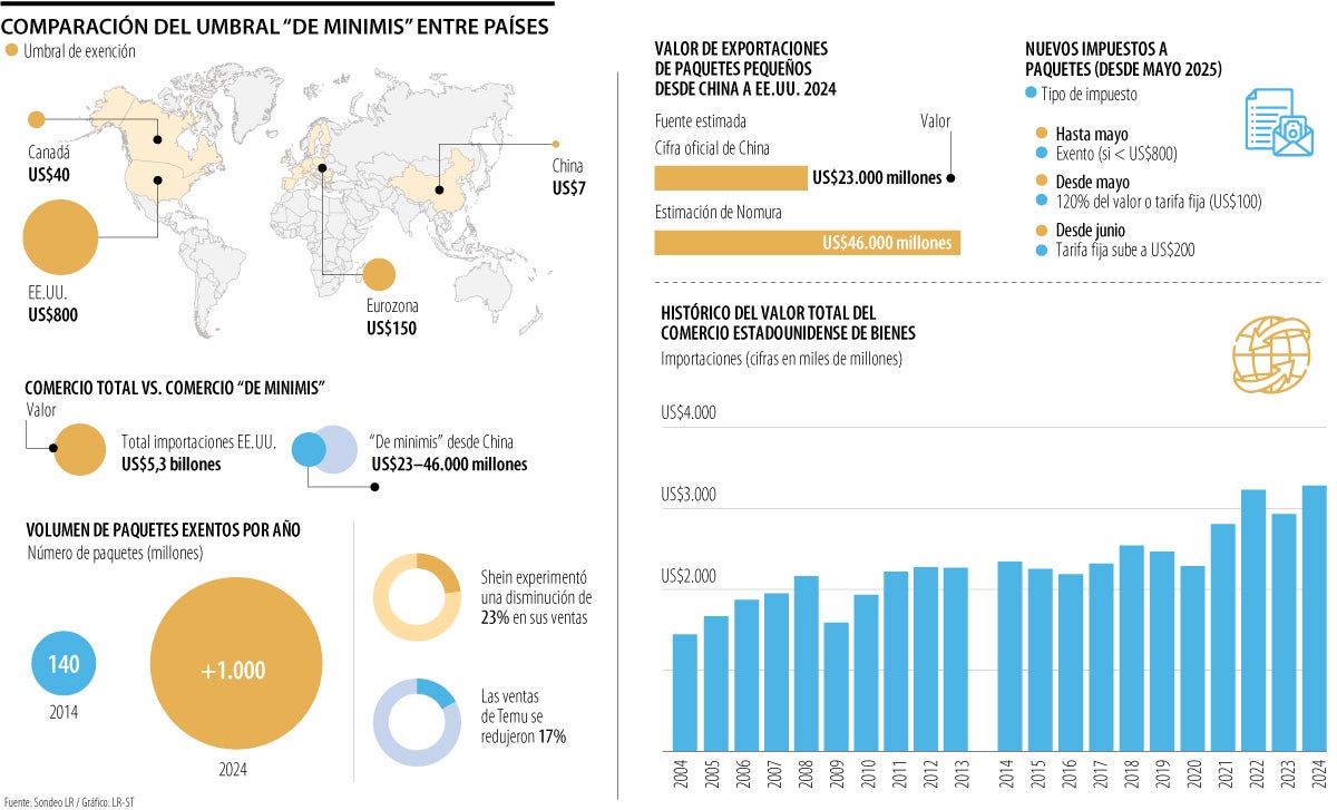 Hasta hace dos semanas, los paquetes considerados de minimis gozaban de beneficios como la exención de declaraciones aduaneras y de aranceles. Aunque cada envío individual es pequeño, han llegado en grandes volúmenes a EE.UU. a través de plataformas de descuentos como las tiendas Shein, Aliexpress, Temu y Shopee. De hecho, en 2024 llegaron a representar US$46.000 millones de las importaciones.