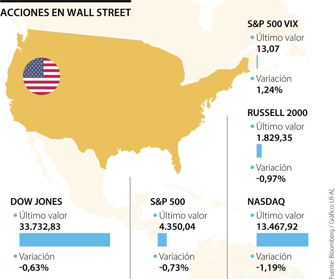 El Promedio Industrial Dow Jones .DJI perdía 171,05 puntos, o 0,50%, a 33.775,66 unidades; mientras que el S&P 500 caía 33 puntos, o un 0,75%, a 4.348,89 unidades. El Nasdaq Composite cedía 160,32 puntos, o un 1,18%, a 13.470,29 unidades.