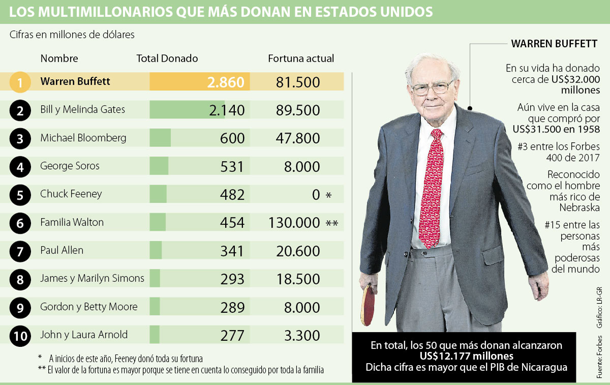 El tercer hombre más rico de mundo es el más generoso de Estados Unidos. La revista Forbes reveló que el empresario Warren Buffett fue quien más dinero donó el año pasado tras entregar a causas benéficas US$2.860 millones. En total, los 50 multimillonarios más generosos donaron US$12.200 millones, lo que representó un crecimiento desde los US$11.100 millones que se registraron en 2015.