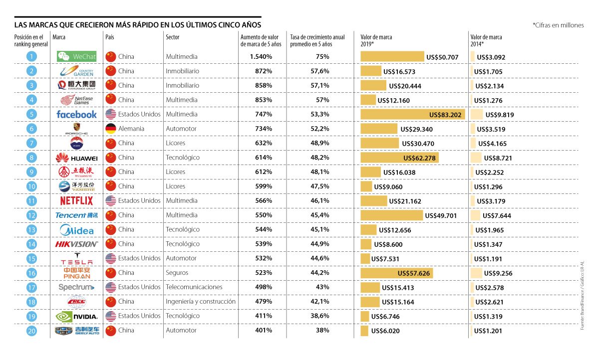 Las cuatro primeras marcas en la lista provienen de China. WeChat figura en la primera casilla del ranking con un crecimiento de su valor de marca de 1.540% en los últimos cinco años y una tasa de crecimiento anual promedio en cinco años de 75%. Según el informe, el valor de la marca WeChat, que en 2014 se ubicó en US$3.902 millones, hoy alcanza los US$50.707 millones.
