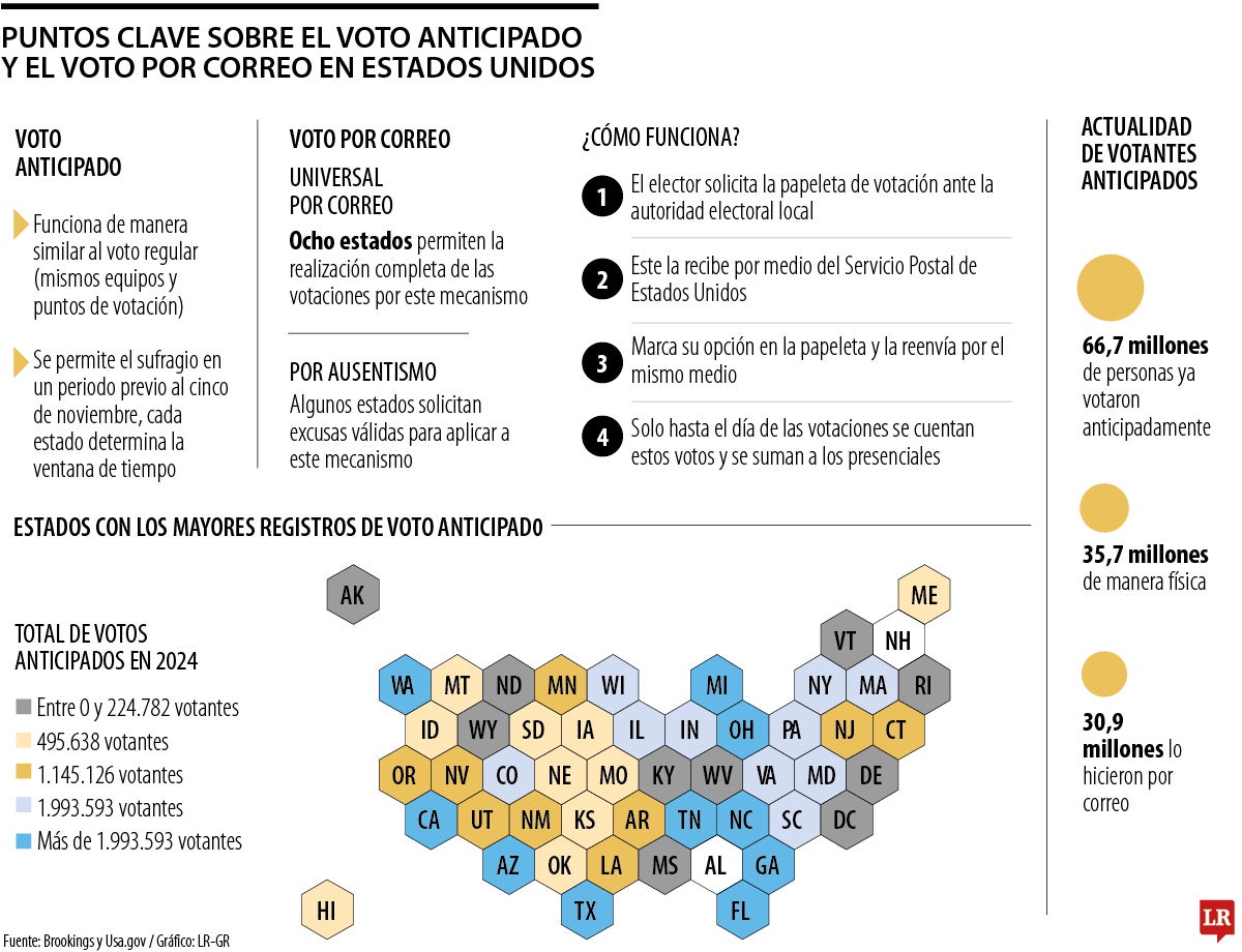 De acuerdo con el Laboratorio Electoral de la Universidad de Florida, hasta la mañana del viernes, 66,7 millones de estadounidenses ya habían votado anticipadamente: 35,7 millones de forma presencial y 30,9 por correo. Sin embargo, se espera que esta cifra no supere los registros de 2020 cuando se alcanzaron 100 millones de votos en medio de la pandemia.