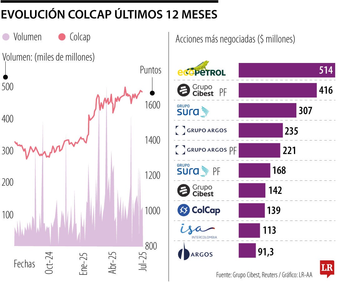 Las acciones más negociadas en julio fueron Ecopetrol, Cibest y Grupo Sura, donde el promedio de negociación diario en el mercado se ubicó en COP123.593 millones