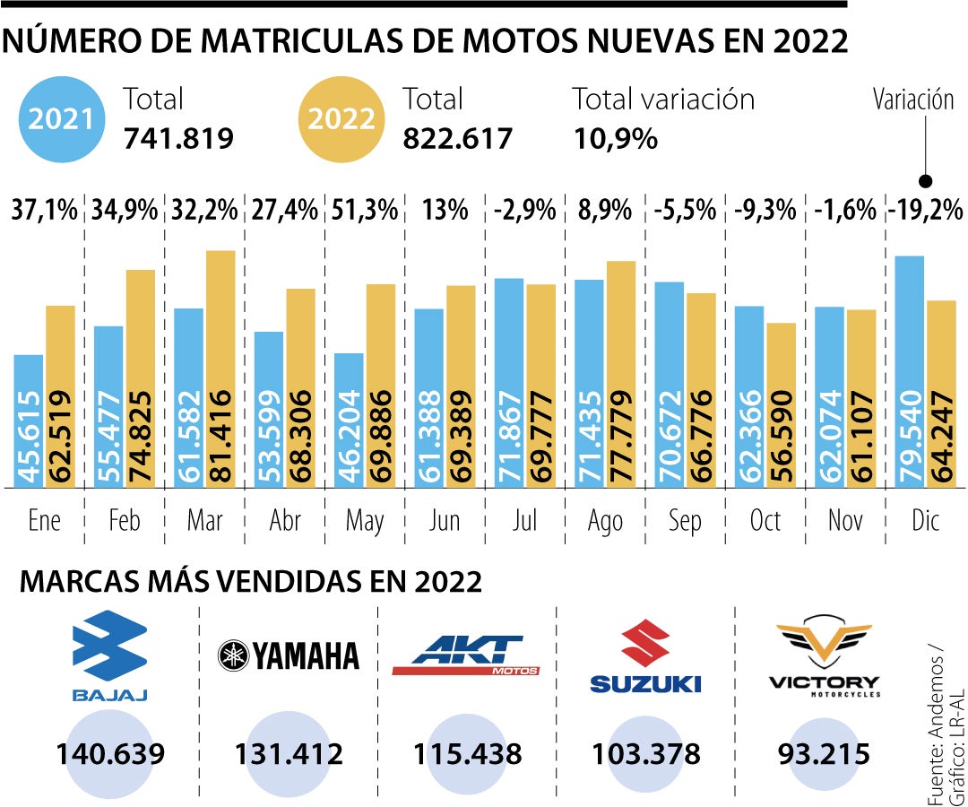 Las tres empresas lideraron con 376.944 unidades vendidas en el año. En total el sector logró comercializar 805.920 motos, 11% más que las registradas en 2021