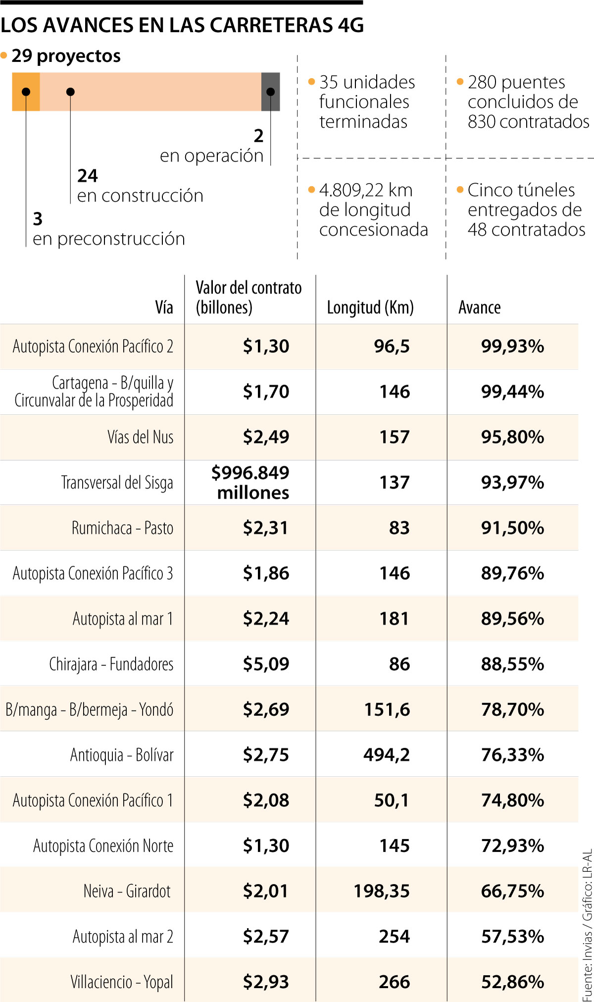 Hay 29 proyectos de cuarta generación en construcción. hasta el momento se han invertido $27,95 billones, 59,33% del presupuesto