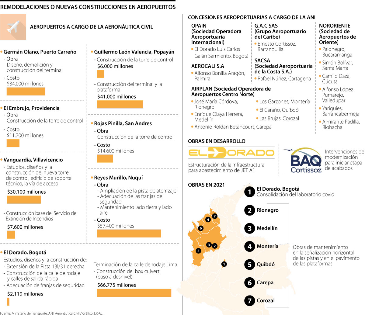 El Ministerio de Transporte informó que la Agencia Nacional de Infraestructura (ANI) tiene vigentes seis concesiones aeroportuarias que operan 16 terminales y, actualmente, estas empresas realizan obras de mantenimiento en seis aeropuertos, como por ejemplo la rehabilitación de la calle de rodaje y el viaducto de ingreso y salida de pasajeros en el de Rionegro; mientras que el Aeropuerto Ernesto Cortissoz de Barranquilla está en la fase II de su modernización.