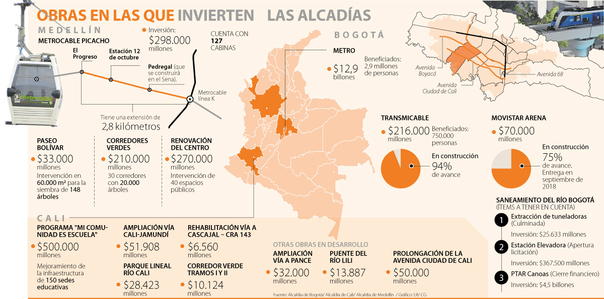 Por otro lado, en Medellín, la alcaldía invirtió $298.000 millones en la construcción del Metrocable Picacho, el cual tendrá 127 cabinas y una longitud de 2.800 metros; para la renovación del centro, en la que serán intervenidos cerca de 40 espacios, se destinaron $270.000 millones y para las obras del Paseo Bolívar $33.000 millones