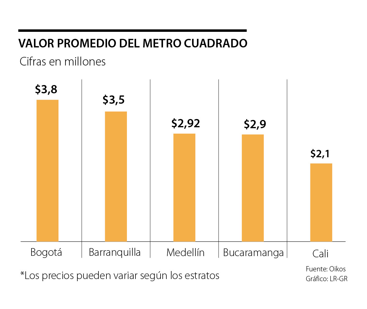 En Barranquilla se puede encontrar el metro cuadrado alrededor de $ 3,5 millones, Oikos señaló que también se podrán encontrar apartamentos en esta ciudad costera en estrato 2, desde $1,6 millones.