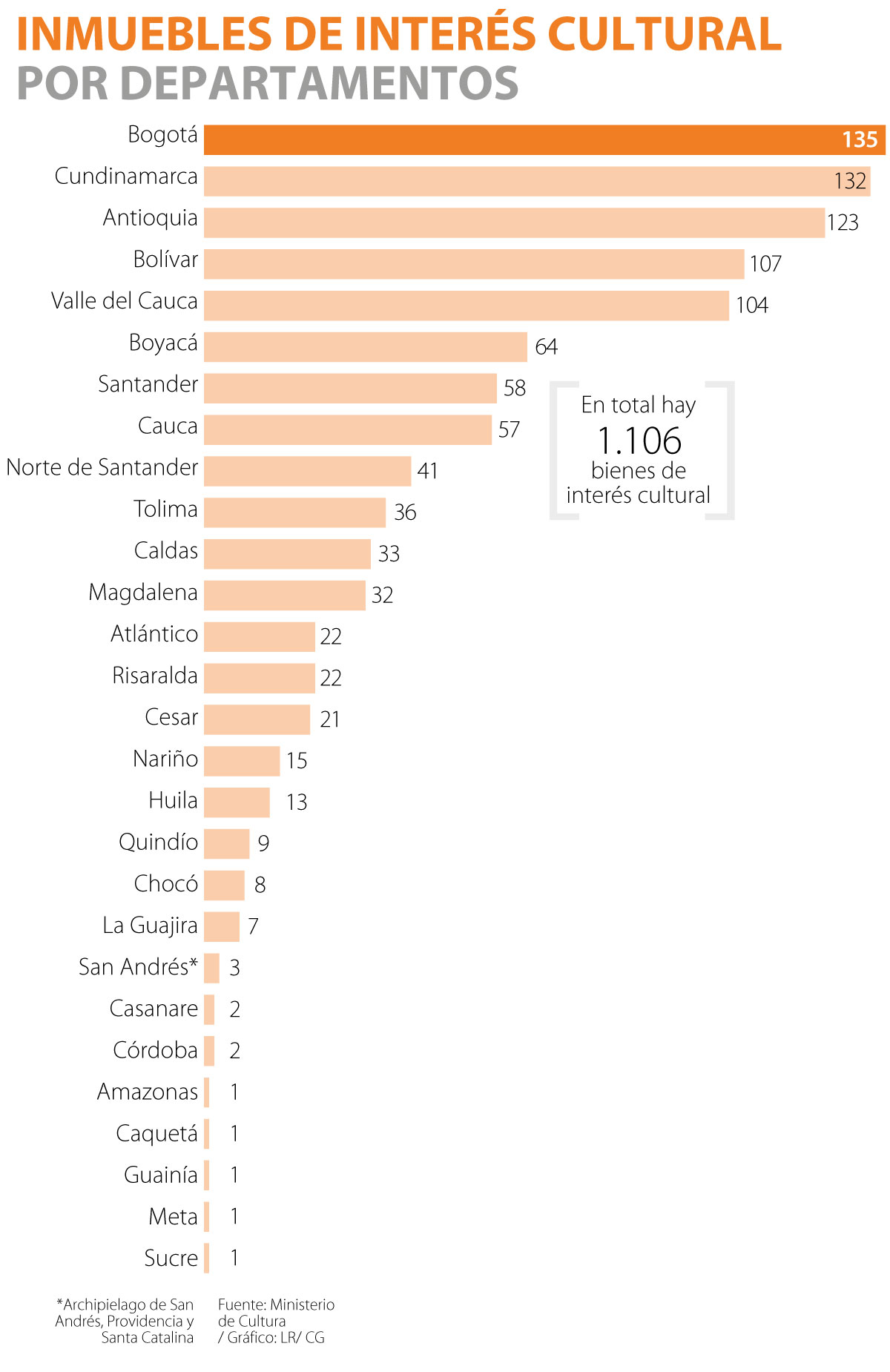 Según la lista de inmuebles declarados bienes de interés cultural de ámbito nacional, actualizada al 26 de junio y publicada por el Ministerio de Cultura, Bogotá (135), Cundinamarca (132) y Antioquia (123) son las zonas del país con más inmuebles clasificados como bienes de interés cultural (BIC).