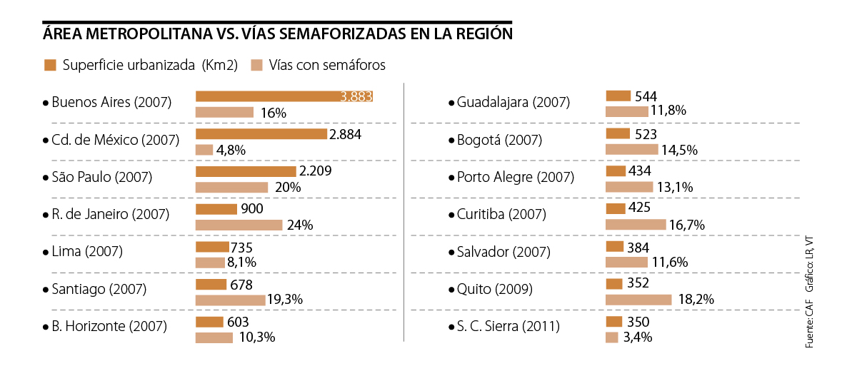 La misma ciudad, con 14,5% de sus vías semaforizadas, ocupa la posición número 13 en la lista de ciudades de América, revelando la falta de artefactos que necesita la capital.