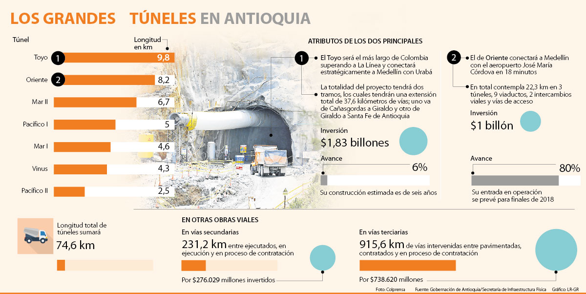 La construcción y adecuación de túneles en Antioquia que incluyen obras como el Toyo; el de Oriente -estos dos que estarán entre los tres más extensos de Colombia junto con el de La Línea- en las autopistas Mar 1 y 2; Pacífico 1 y 2 y el túnel de La Quiebra en la Concesión Vinus sumarán 74,6 kilómetros de extensión en pro de aumentar la conectividad del departamento con las diferentes regiones del país.