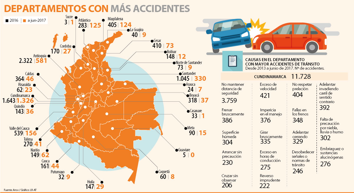 En 2016, se registraron 7.158 víctimas fatales por accidentes de tráfico siendo Antioquia (2.322), Cundinamarca (1.643), Santander (1.045) y Valle del Cauca (539) los departamentos con el mayor número de contratiempos totales.