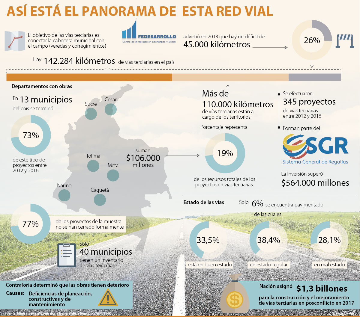 Una auditoría de desempeño divugada a finales del año pasado por la Contraloría General de la República reveló que 13 municipios tienen comprometida la operación eficaz de sus vías terciarias, las cuales fueron financiadas con recursos del sistema general de regalías para el sector transporte. Entre los datos más importantes revelados por el órgano de control, sobresale que 77% de los proyectos de la muestra no se habían cerrado formalmente por falta de papeles, porque había saldos pendientes con la interventoría o porque no se cumplían los requisitos que se necesitaban.