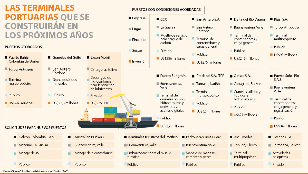 Hay 17 terminales portuarias que entrarían en operación en los próximos años. De estas, tres ya obtuvieron una resolución de otorgamiento, ocho ya tienen condiciones otorgadas y seis están en evaluación o esperan conceptos de las autoridades para fijar condiciones, según la Cámara Colombiana de la Infraestructura.