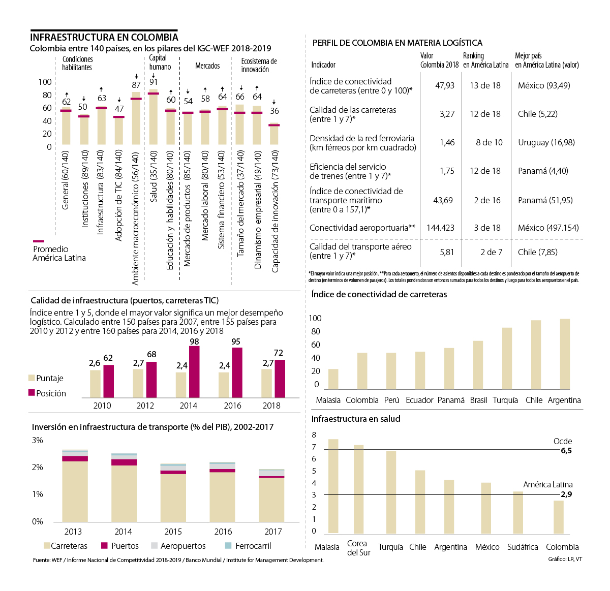 De acuerdo con el más reciente Informe Nacional de Competitividad 2018-2019, revelado por Consejo Privado de Competitividad, la infraestructura en Colombia ocupa la posición número 83. De acuerdo con el estudio, esa posición de Colombia se debe a que “el Gobierno Nacional logró avances fundamentales en infraestructura de transporte tras varias décadas de retrasos, con un incremento notable de la inversión pública en el sector que llegó a 2,7% del PIB en 2016, el programa de concesiones viales de 4G y una institucionalidad robusta, compuesta por la Agencia Nacional de Infraestructura, la Financiera de Desarrollo Nacional y la arquitectura normativa de la Ley de Asociaciones Público Privadas”, señaló el documento.