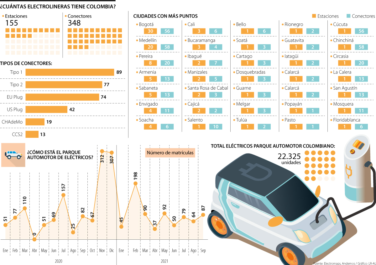 Al revisar las estadísticas de Electromaps, a octubre de 2021, Bogotá es la ciudad que lidera en número de estaciones y conectores con 30 y 56, respectivamente, seguido por Medellín, que registra 20 puntos de carga y 58 conectores.