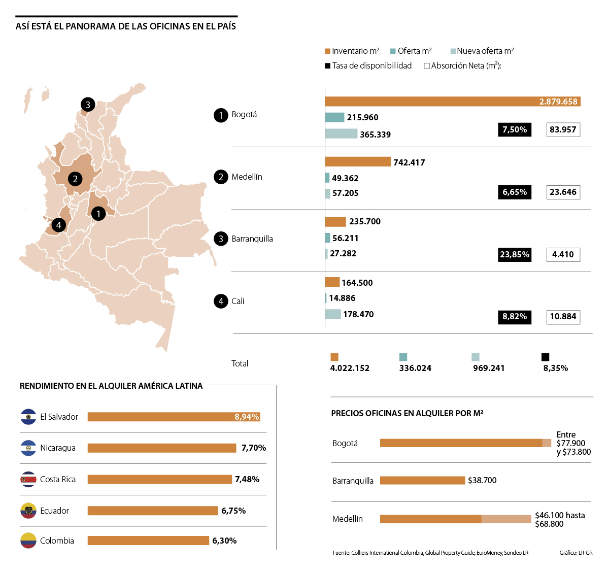 Según Colliers, el inventario nacional de oficinas en el país es de más de cuatro millones de metros cuadrados lo que se traduce en 435 edificios, una oferta de 336.024 metros cuadrados (m2), una demanda de 122.897 m2 con una tasa de disponibilidad de 8,35% y una nueva oferta de 969.241 metros cuadrados que se dará entre 2020 y 2022.