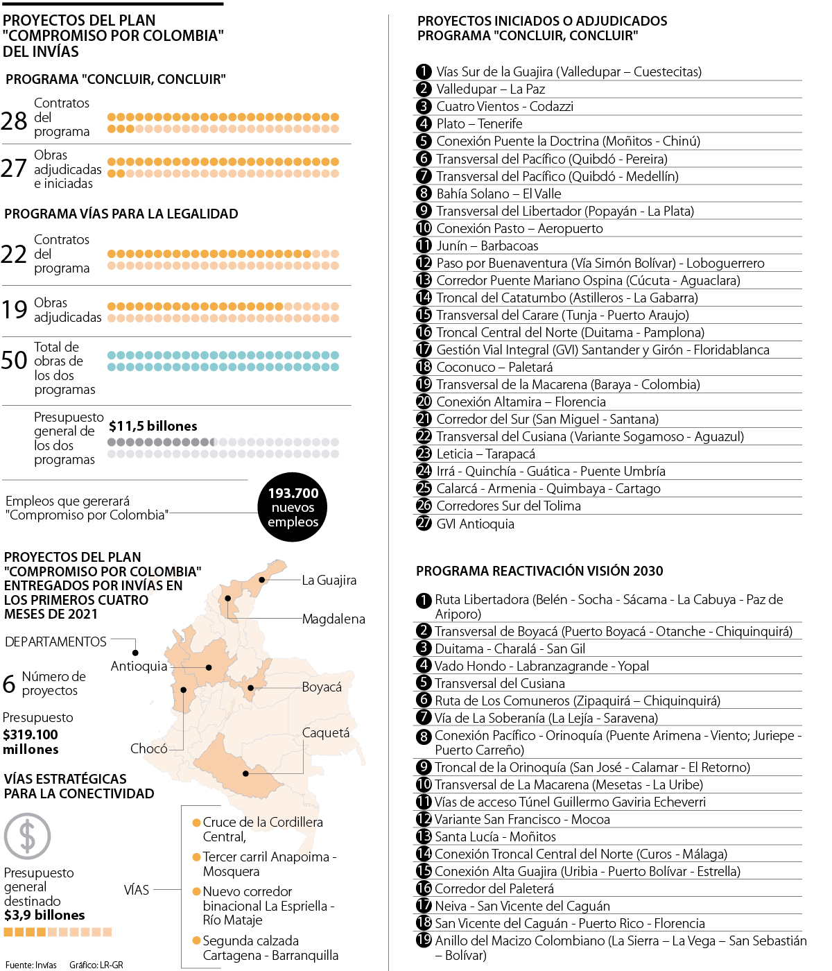 Este programa de inversión es, según la ministra de Transporte, Ángela María Orozco, el más ambicioso del Gobierno Nacional para la reactivación de las regiones, porque, además del presupuesto que requiere, permitirá generar 193.700 nuevos empleos directos e indirectos.