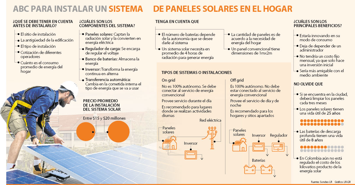 Luego de saber si el lugar es viable para la instalación, es necesario definir el tipo de sistema que se usará. Hay dos: on grid y off grid. “El primero no es 100% autónomo, ya que se debe conectar al servicio de energía convencional”, dijo Laura Suárez Vega, gerente de planeación de Enercenit. Mientras que el off grid es 100% autónomo y según Vega es recomendado para los hogares, ya que provee el servicio tanto en el día como en la noche. A su vez, este tipo de instalación también es recomendado para sitios apartados donde es muy difícil que llegue la energía con un operador como EPM, Codensa, entre otros, según señaló Chica.