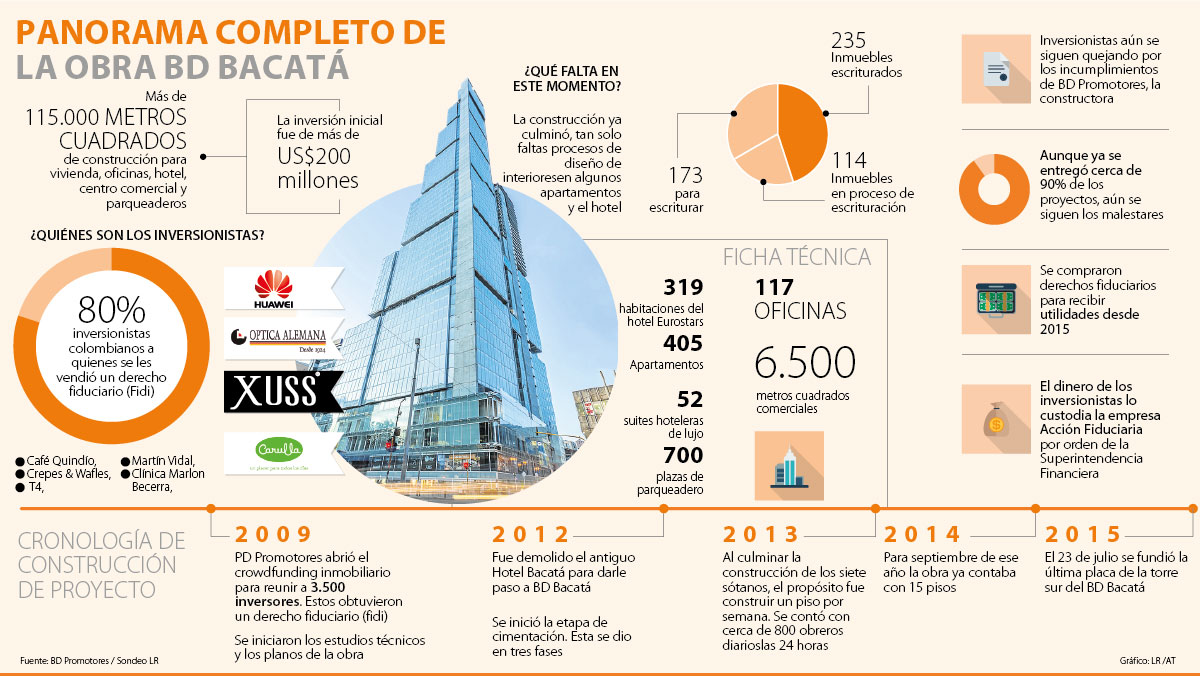 Han pasado un poco más de seis años desde que se inició la construcción del primer rascacielos del país, el BD Bacatá. Aunque inicialmente se tenía estipulado que las primeras entregas de la obra serían en 2015, los líos entre BD Promotores, desarrolladora del proyecto, y los inversionistas continúan: mientras que la empresa asegura que ya se entregó 90% de la edificación y los locales comerciales, los accionistas afirman que aún no reciben rentabilidades.