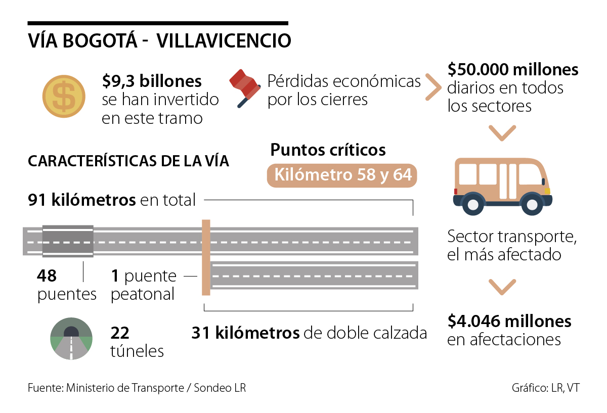 Uno de los tramos con mayores dificultades es Bogotá- Villavicencio. La situación que se ha visto en los últimos días ha obligado a Coviandes a aumentar sus trabajos en los puntos críticos (kilómetro 58 y 64) con el objetivo de habilitar la movilidad de la carretera. Aunque este tramo tradicionalmente se ha visto expuesto a un gran número de derrumbes, el Gobierno ya anunció que se dispondrán $20.000 millones para atender la vía. Con este dinero, serían $145.000 millones los que se han invertido para mejorar las condiciones.