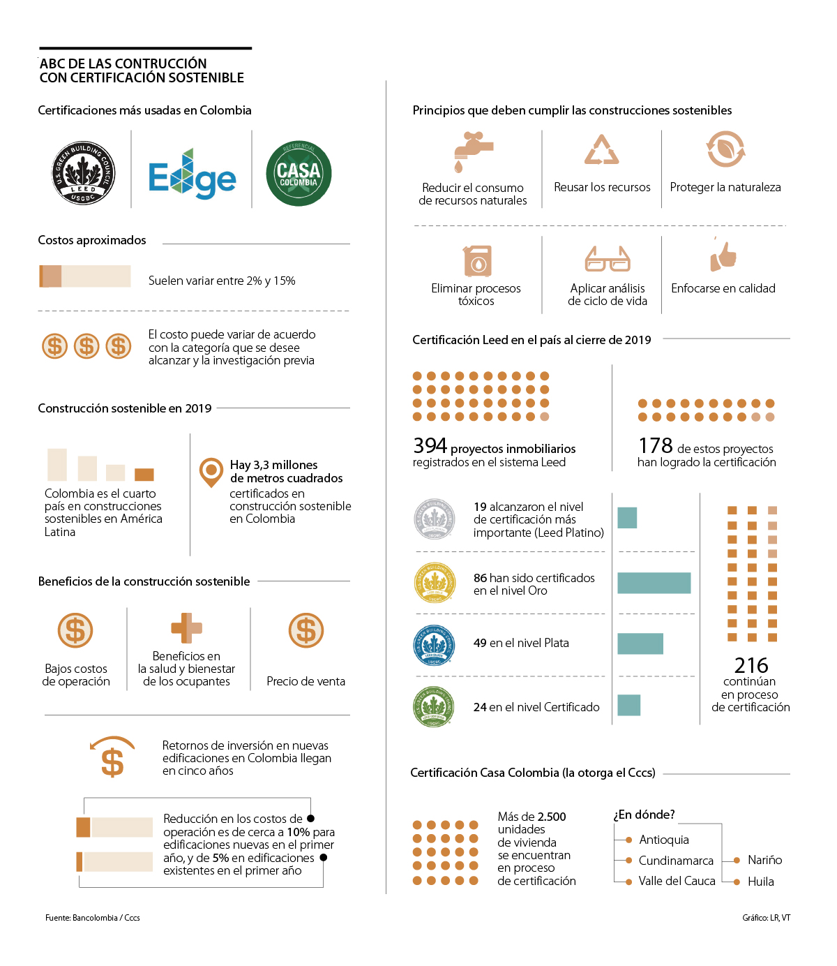 Para lograr tener un estatus de construcción sostenible, los interesados deberán certificarse. Según Bancolombia, las certificaciones más usadas en la denominada infraestructura verde en el país son ‘Leed’, ‘Edge’ (creada por el IFC y es un complemento de Leed) y ‘Casa Colombia’ (promovida por el Consejo Colombiano de Construcción Sostenible (Cccs), el cual tiene un foco determinado en vivienda y una certificación especial para viviendas de interés social VIS).