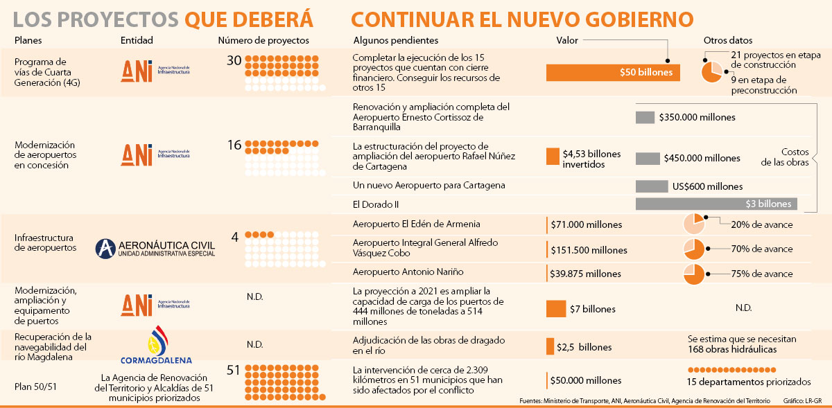 A pocos días de terminar el segundo periodo de Juan Manuel Santos en la Presidencia, se evidencian los desafíos que en materia de infraestructura deberá asumir el nuevo Gobierno. El ambicioso programa de autopistas de cuarta generación (4G) deberá continuar, lo que implica el cierre financiero de 15 proyectos de los 30 que se encuentran adjudicados y seguir de cerca la ejecución de cada uno de ellos. A marzo de este año, solo dos proyectos del programa presentaban un avance de obras superior a 70%.