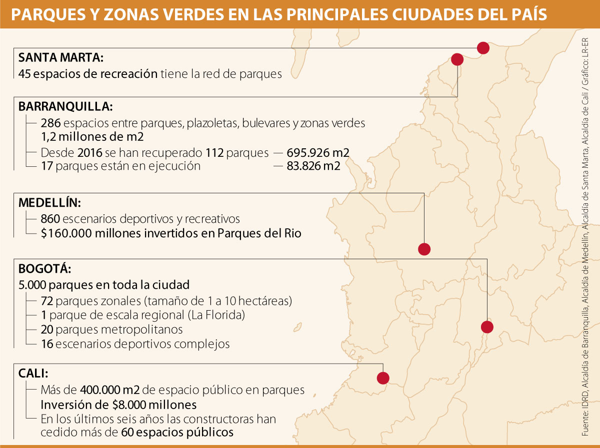 En Colombia, la ciudad que lleva la delantera en este aspecto es la capital del país, pues cuenta, según cifras del Instituto Distrital de Recreación y Deporte (Idrd) con más de 5.000 parques, mientras que Medellín en la actualidad tiene 860 escenarios deportivos y recreativos, y Barranquilla suma 286 espacios públicos de este tipo.