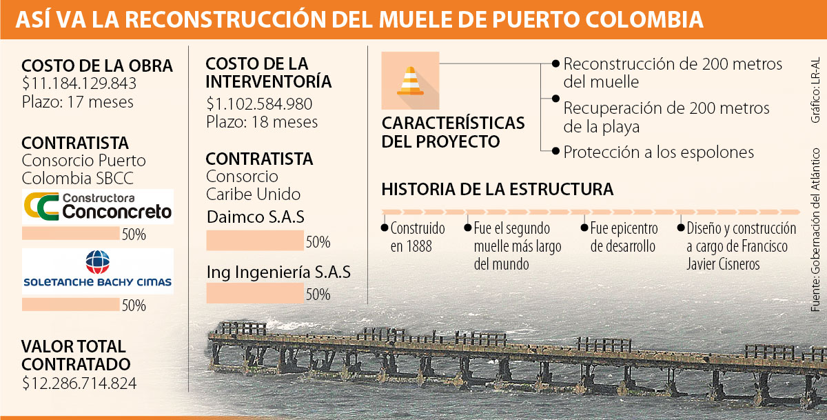 En mayo de 2018 se anunció que la obra ya tenía contratista. El Consorcio Puerto Colombia SBCC será la firma encargada de los trabajos. Está conformada por la constructora Conconcreto S.A. que tiene 50% de participación y la otra mitad le corresponde a Soletanche Bachy Cimas S.A. El valor total de la reconstrucción es de $11.184 millones, de los cuales, la administración departamental puso $9.100 millones y el resto de recursos son aportados por el Ministerio de Comercio, Industria y Turismo, a través de Fontur.