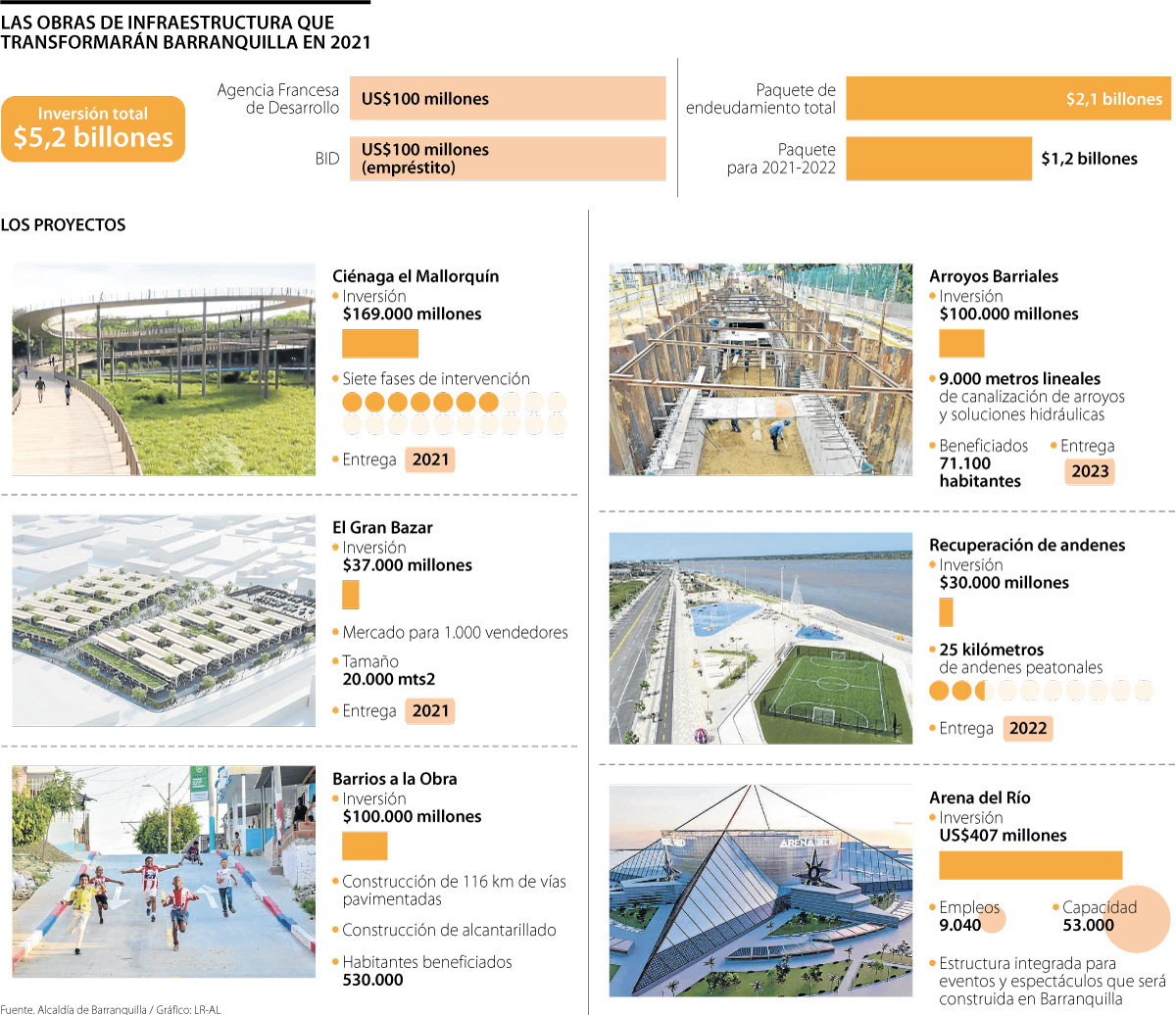 En esa vía, el alcalde Jaime Pumarejo, anunció la realización de un paquete de cinco obras público-privadas, que con una inversión de $5,2 billones y la generación de 90.000 puestos de trabajo entre 2020 y 2023, pretenden cambiarle la cara a la ciudad y posicionarla como polo de desarrollo en el país.