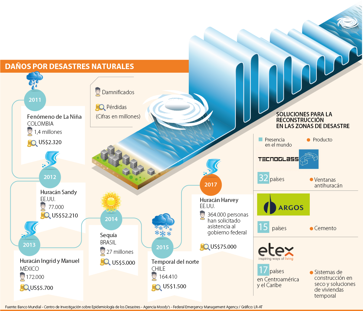 Durante la reconstrucción se requieren soluciones de alojamiento inmediatas. Empresas como Etex, exportan desde Colombia a 17 países de Centroamérica y el Caribe. Estas exportaciones representan entre 10 % y 15% de la facturación de la compañía. El fuerte de esta empresa son las soluciones de construcción en seco, drywall, placas cementeres y protección pasiva para el fuego.