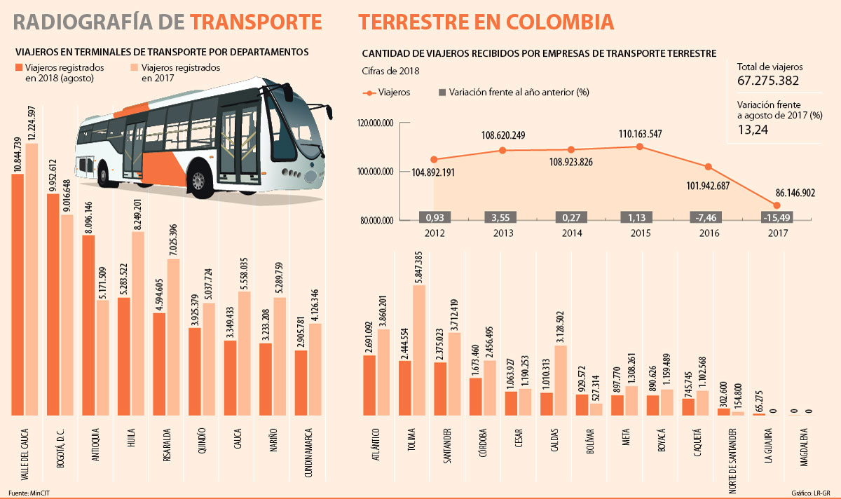 A pesar de la constante innovación en términos de transporte y las facilidades de acceso que se dan para comprar automotores como carros o motos, los sistemas de transporte terrestre mantienen una preponderancia importante en este territorio. Para este año, han sido más de 67 millones los viajeros que se han reportado viajando desde terminales de transporte público, según cifras de Citur.