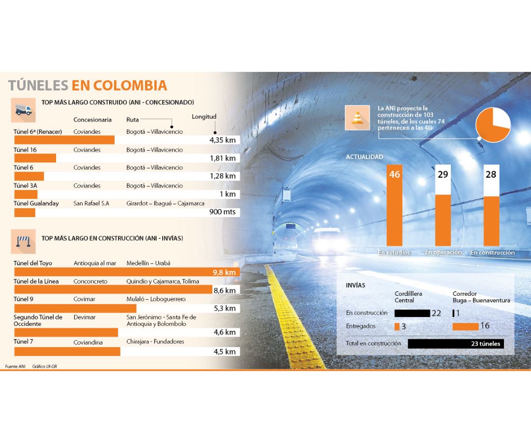 De acuerdo con la Agencia Nacional de Infraestructura (ANI), se proyecta la construcción de 103 túneles entre la 1,2,3 y 4 generación, de los cuales 74 pertenecen a proyectos de 4G. En la actualidad, hay 28 túneles en construcción, 46 en estudios y diseños, y 29 en operación. Igualmente, la Agencia destacó que la región donde se construyen más túneles es el corredor vial que comunica a Bogotá con Villavicencio. En esta autopista, entre el segundo (18) y tercer (7) tramo, quedaría con 25 túneles. Sin embargo, para 2018, no se tiene estimada la entrega de corredores bajo tierra, debido a que la gran mayoría de las obras de carreteras de cuarta generación inician la etapa de construcción.
