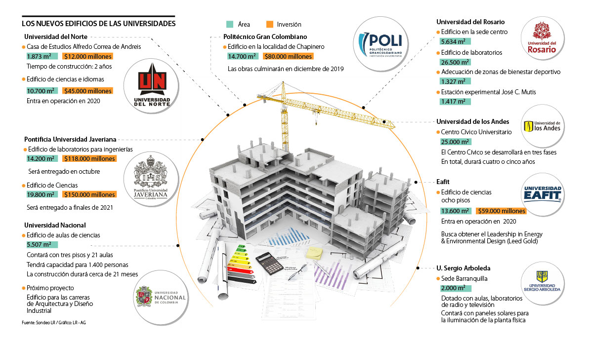 La infraestructura es un factor determinante para el desarrollo de la educación. Tener espacios amenos, adecuados y con las herramientas necesarias es un factor ligado a los resultados académicos y a la calidad de la formación. Por esto, las universidades del país invierten todos los años en nuevas estructuras como laboratorios, gimnasios, bibliotecas o auditorios. En 2019, las principales instituciones de educación superior en el país tienen en construcción más de 142.000 metros cuadrados que se sumarán a los campus universitarios.