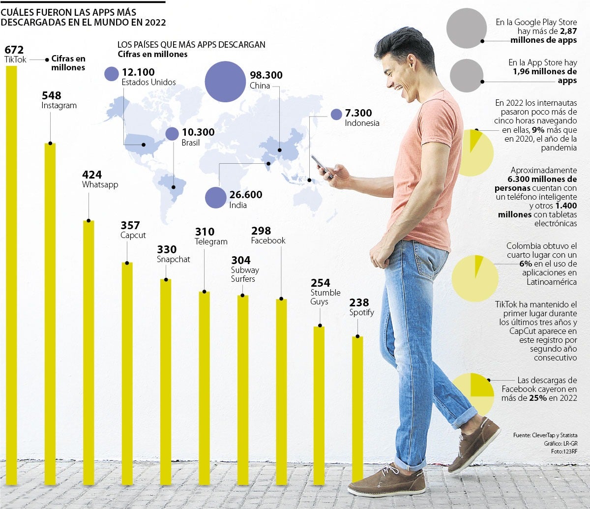 En un informe publicado por CleverTap, TikTok, como en los últimos tres años, se quedó en el primer lugar luego de registrar más de 672 millones de descargas, solo en 2022, lo que dejó relegadas a Instagram (548 millones) y Whatsapp (424 millones). En el mundo, aproximadamente 6.300 millones de personas cuentan con un teléfono inteligente y otros 1.400 millones con tabletas electrónicas.